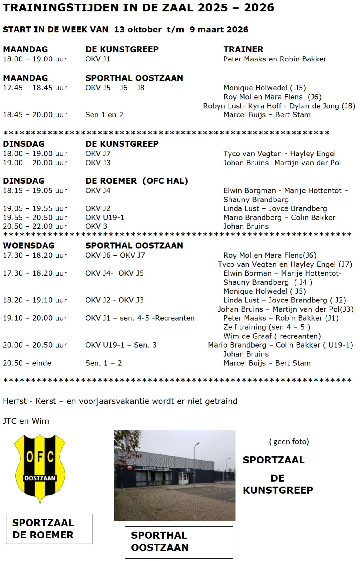 TRAININGSTIJDEN IN DE ZAAL 2025 – 2026
